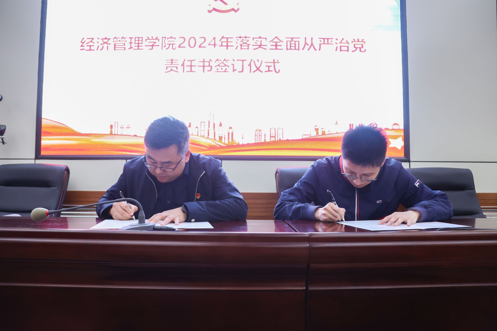 会议举行了2024年落实全面从严治党责任书签订仪式。党委书记于云亮代表学院党委与学院其他领导班子成员和教工党支部书记签订《落实全面从严治党责任书》。