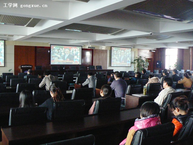 在学院多功能厅内,大家认真观看开幕式盛况,聆听胡锦涛总书记所做的工作报告。