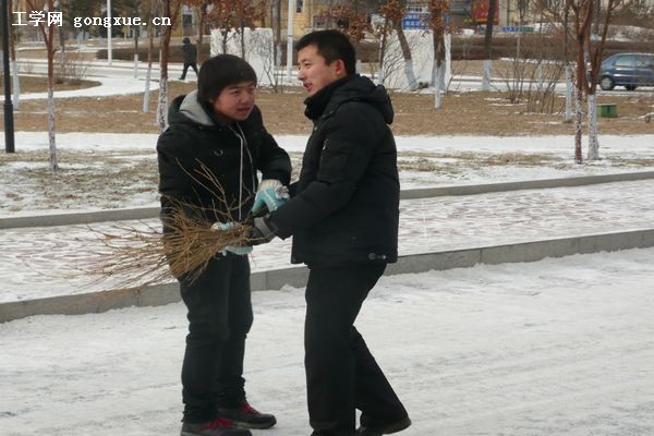 12月21日晚哈尔滨迎来了又一场雪。这雪覆盖了学校校路,给道路交通带来诸多不便。 12月22日中午,在经管学院的组织下,11级大一新生开始了这个冬天里的第一次扫雪活动。伴随着凛冽的寒风,气温骤降,扫雪任务异常艰巨。接到扫雪的命令后,911班同学纷纷赶往基础楼,领取扫雪工具,来到了校路上开始了清扫。由于条件的限制,学校配备的除雪工具只有铁锨和扫帚,加上零下十几度的低温,使除雪工作更加艰难,同学们的手和脸都冻得通红。但是这丝毫没有影响同学们的积极性,大家都热火朝天的干着。大一指导员侯磊也参加到扫雪中来,给同学们关怀和指导。