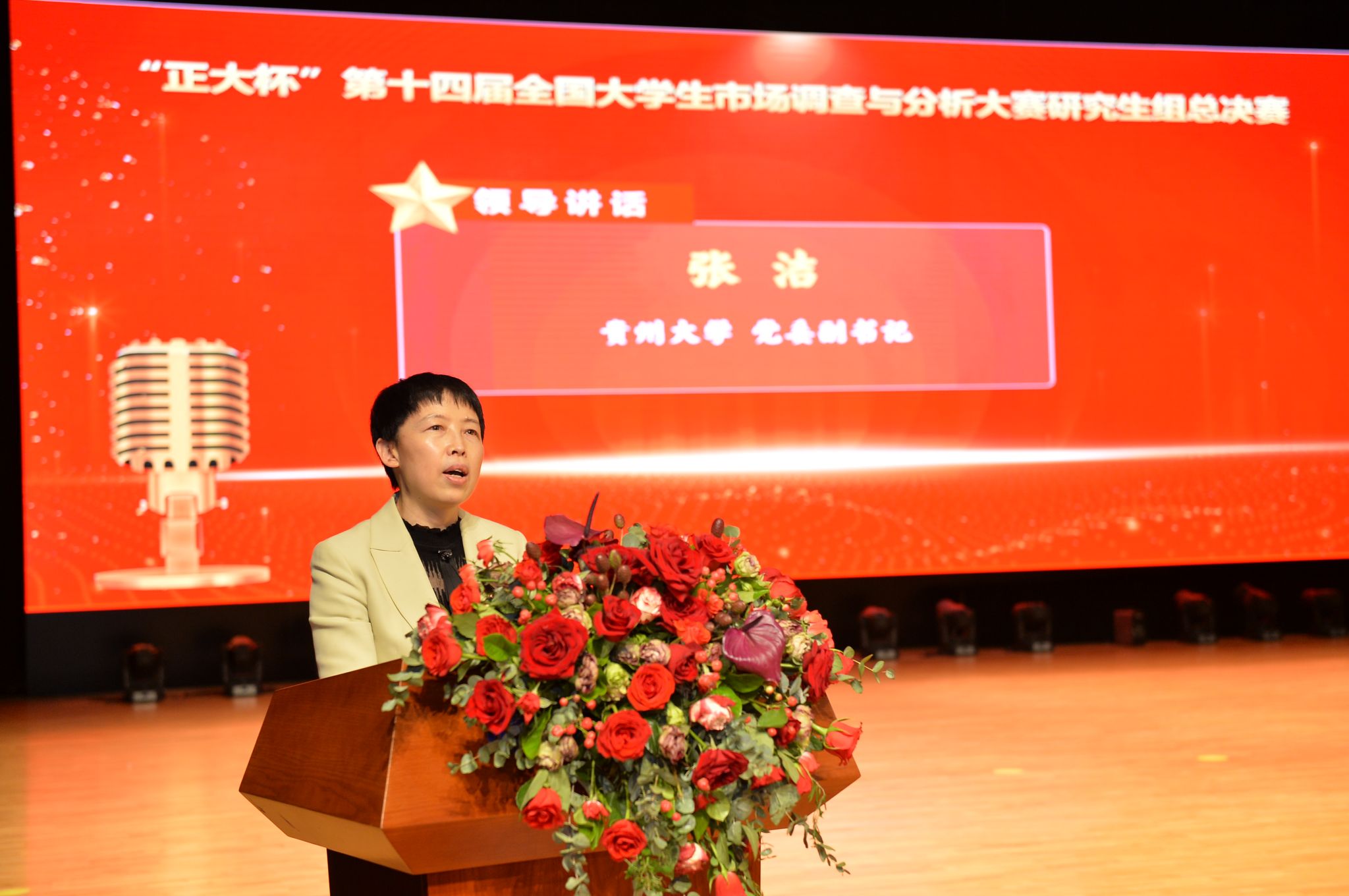 贵州大学党委副书记张洁接过赛旗后发表讲话。她首先代表贵州大学对本次大赛的成功举办表示热烈的祝贺。她介绍,贵州大学是教育部、贵州省人民政府“部省合建”的国家“211工程”大学,国家“双一流”建设高校。学校高度重视大学生创新创业工作,将创新创业教育作为落实立德树人根本任务、提高人才培养质量、促进科技成果转化的重要抓手,多措并举培养学生的创新精神和实践能力。她指出,市调大赛将价值塑造、知识传授和能力培养三者有机融为一体,推动教育链、人才链、创新链、产业链有机衔接,已成为学术引领、政府支持、企业认可的协同育人平台和广受高校师生喜爱的赛事品牌。