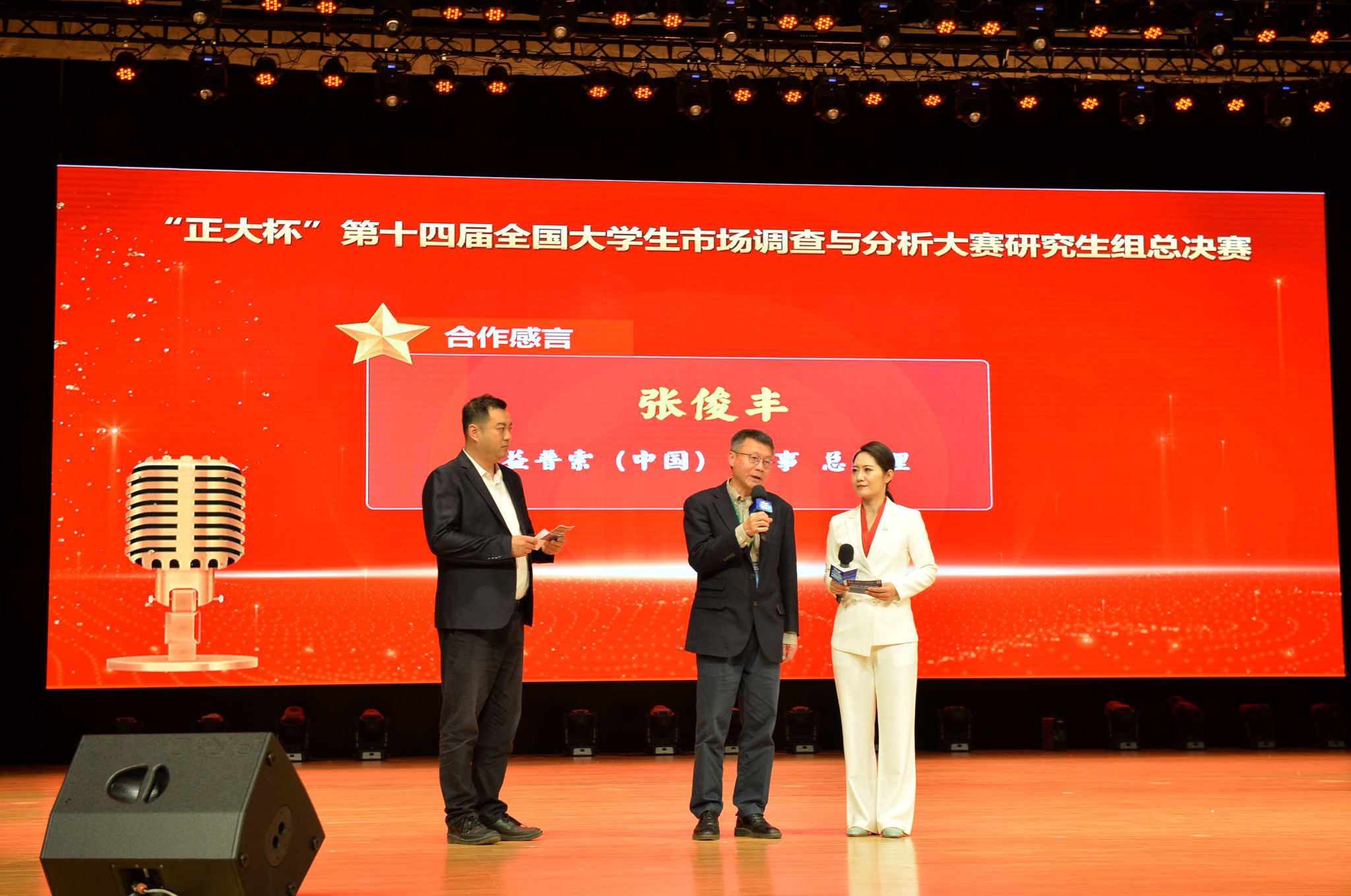 益普索(中国) 董事、总经理张俊丰先生代表益普索(中国)在闭幕式上发表合作感言。他表示,各团队的研究成果与现实市场调研内容息息相关。参赛选手们为理论问题提供的数据分析和消费者市场分析,有助于企业形成一套的完整的理论框架和落地方法,这种与高校的合作是非常有意义的。他指出,益普索(中国)一直坚持和中国商业统计学会合作,也希望可以继续支持、赞助大学生参加市场调查与分析大赛。