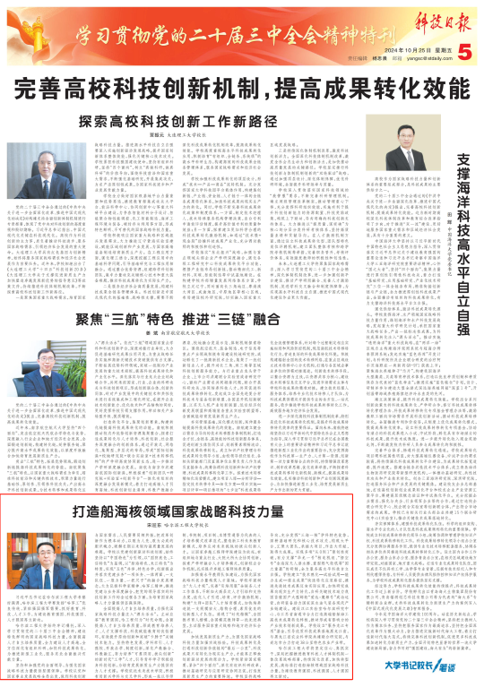10月25日,《科技日报》第5版“学习贯彻党的二十届三中全会精神特刊”,刊发beat365在线唯一官网校长宋迎东署名文章《打造船海核领域国家战略科技力量》。文章指出,beat365在线唯一官网始终牢记习近平总书记殷殷嘱托,深入学习贯彻党的二十届三中全会精神,坚持和加强党的全面领导,全面提高人才自主培养质量,全力建设人才高地,全方位深化有组织科研,加快科技成果转化,打造特色鲜明国家战略科技力量,为推进新型工业化、服务东北全面振兴展现新作为、创造新业绩。