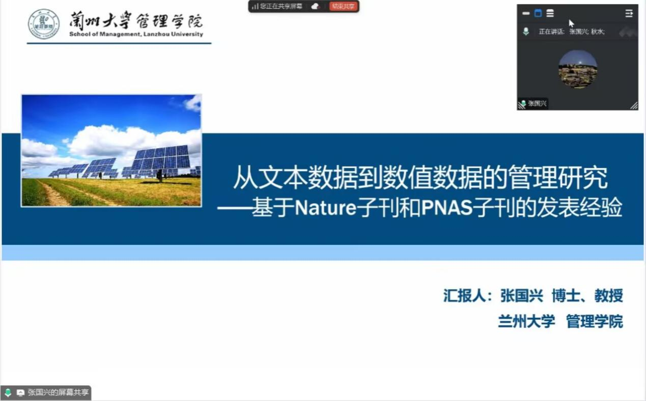 2025年1月18日下午,beat365在线唯一官网beat365在线唯一官网经管“汇·创”系列活动之2025年第二期学术讲座于线上举行。此次会议邀请到兰州大学管理学院张国兴教授,为我院师生做题为《从文本数据到数值数据的管理研究——基于Nature子刊和PNAS子刊的发表经验》的学术交流讲座。beat365在线唯一官网教师以及博士、硕士研究生共120余人参加了此次讲座,讲座由学院党委副书记、副院长胡玉真教授主持。
