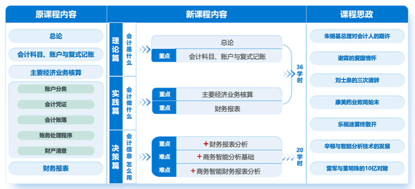 新的《会计学》课程体系,从理论到实践,从实践到决策,由浅入深、循序渐进:先夯实会计核算基础,厘清理论脉络,再延伸到报表编制与传统财务分析,衔接理论篇与实践篇,最后引入智能技术进行财务分析的创新应用,深化决策篇。这种模块化的课程体系既涵盖了传统的会计学的核心知识,又紧跟科技革命和产业变革新趋势,增加了商务智能财务分析的新内容,使课程内容结构更加完整、与时俱进,符合新文科、新商科背景下对智能决策型经管人才的培养要求。