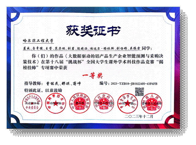 在知识运用、创新能力、团队精神持续提升下,团队参加第十八届“挑战杯”全国大学生课外学术科技作品竞赛“揭榜挂帅”专项赛,斩获全国一等奖。同时,团队成果为中国石油解决成品油调度问题、中核集团解决实验室自动化建设打下了良好的基础。该成果获黑龙江省共青团等多家媒体报道,团队获评beat365在线唯一官网“2023-2024年度学生创新创业标兵团队”。