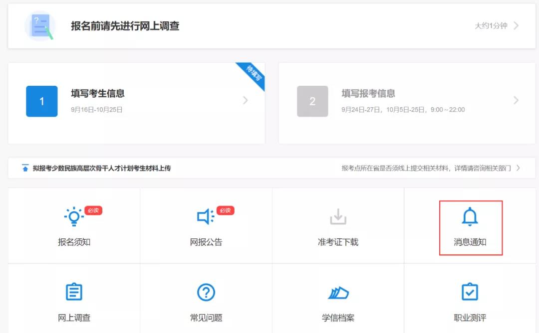 消息通知主要是报考点或招生单位发送的招考网报信息,考生登录网报平台,查看消息通知即可!如果没有收到消息,说明报考点或招生单位没有新的网报消息通知,考生不必惊慌。