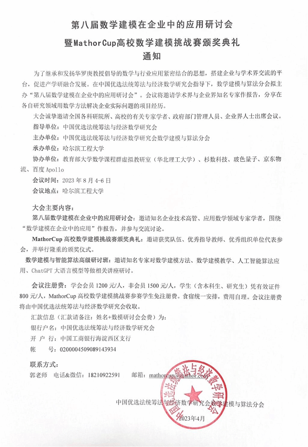 为了继承和发扬华罗庚教授倡导的数学与行业应用紧密结合的思想,搭建企业与学术界交流的平台,促进产学研融合发展。在中国优选法统筹法与经济数学研究会指导下,数学建模与算法分会拟主办“第八届数学建模在企业中的应用研讨会”。会议将邀请学术界与企业界知名专家作报告,分享在各自研究领域用数学方法解决企业实际问题的项目经历。