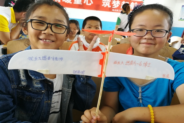 下午的科学小课堂——动手组装橡皮筋动力飞机模型就此开始。首先,同学们被分为两人一组,志愿者们将事先准备好的材料包分发到位。接下来,志愿者陈震、朱博远在讲台前一步步地向同学们演示橡皮筋动力飞机的组装过程及飞行原理,孩子们聚精会神地听着,生怕遗漏了制作的细节。与此同时,小朋友们跟随演示的过程动手实践。“将飞机机翼插入木制骨架”“再插上螺旋桨” ……“最后用橡皮筋连接螺旋桨与尾翼骨架”,十多步并不简单的制作过程在志愿者和小朋友们的齐心协力、共同配合中圆满完成。下午14:30,18组飞机模型俨然成型,同学们将做好的飞机模型翻转过来,在飞机两翼上写下了自己未来的心愿,并在志愿者的引领下,来到了操场上一齐放飞。随着微心愿飞机的起飞,孩子们的梦想也一同展翅翱翔,希望他们通过自身的努力圆梦,而我们,会一直是他们实现梦想的见证者。