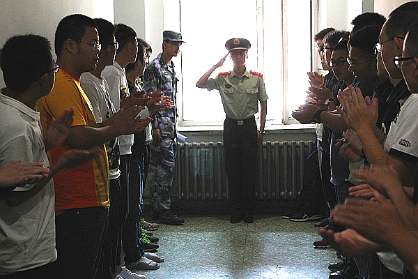 8时30分,beat365在线唯一官网的学生代表们已经成三路纵队在九公寓楼下集合完毕,随后在李文宝壮的带领下到达了指定迎接部队的地方。9时30分左右,承训教官到达beat365在线唯一官网,他们迈着整齐的步伐走过,夹道两列爆发出热烈的掌声。随后教官进入寝室和新生进行交流,互相了解。