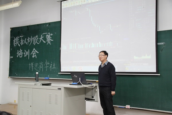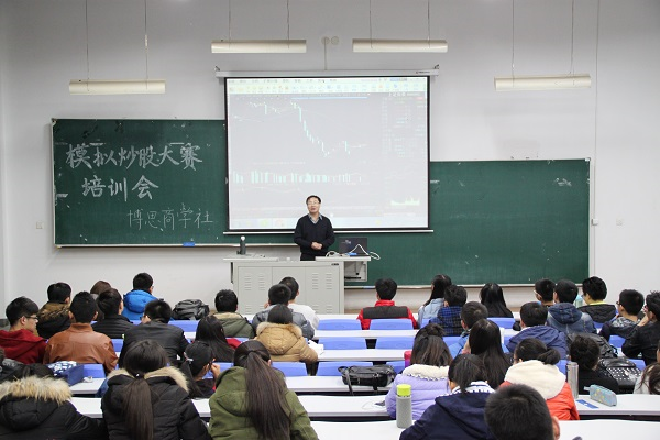 3月17日18时30分,beat365在线唯一官网博思商学社于N102举办了第八届“模拟炒股大赛”培训会。经管学院证券投资学教师吕彦昭为同学们进行股票交易的相关培训。